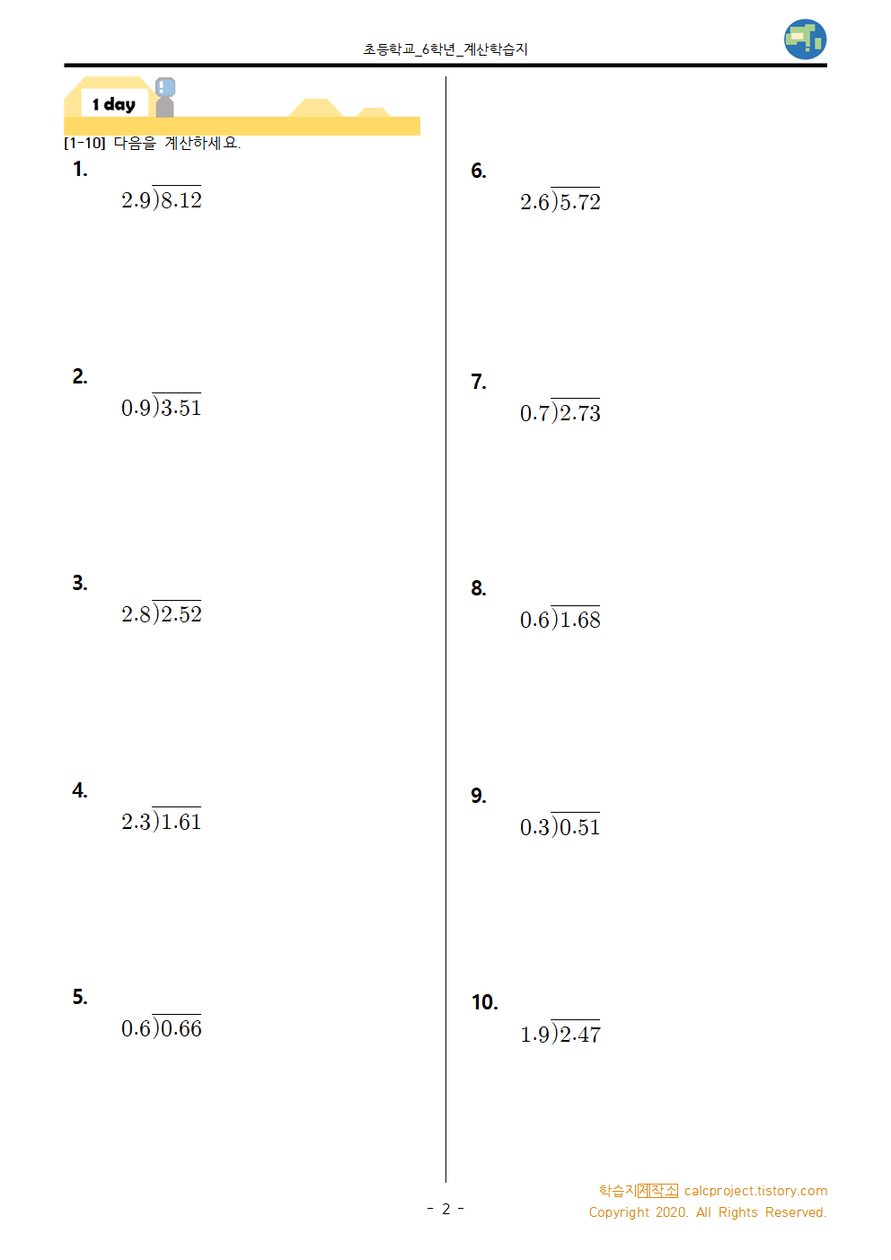 이번 학습지는 (소수 두 자리 수)÷(소수 한 자리 수) 20문항으로 준비했습니다.