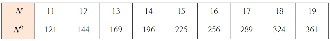 이와 함께 19까지의 제곱수를 암기하면 인수분해에 도움이 됩니다.