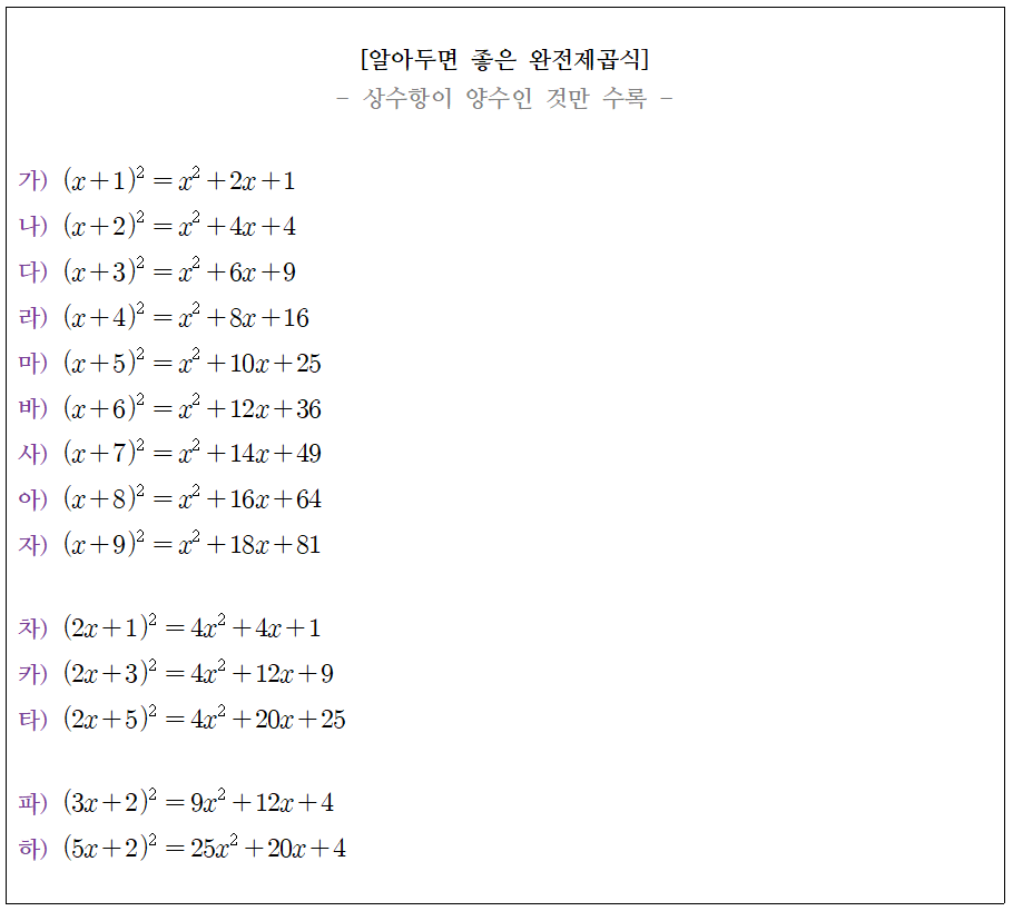 몇몇 완전제곱식의 꼴을 익혀두면 완전제곱식을 빠르게 파악할 수 있습니다.