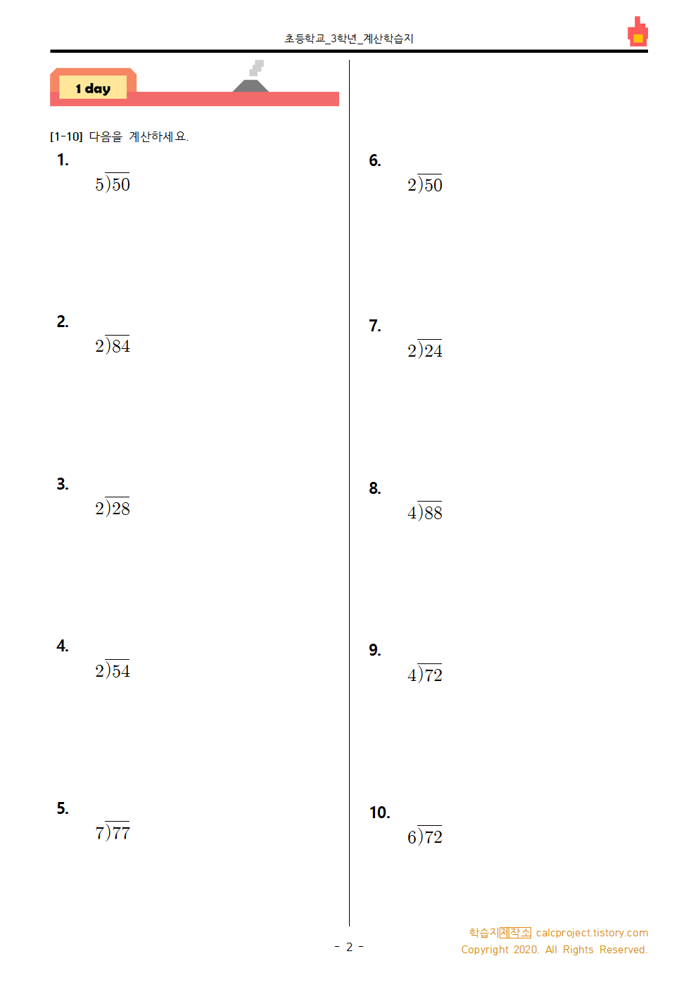 #태그 : 초3, 초등학교 3학년 2학기 나눗셈 연습문제, 몇십몇 나누기 몇, 몇십몇 ÷ 몇, 두 자리 수와 한 자리 수의 나눗셈, 몫, 학습지제작소