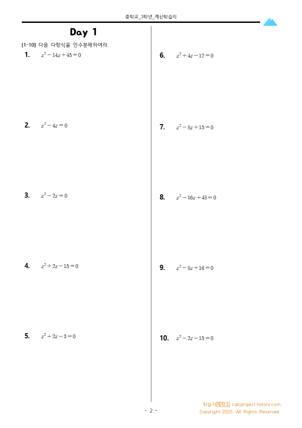 #태그 : 중3, 중학교 3학년, 이차방정식, 이차방정식 문제, 이차방정식 인수분해 풀이, 중근, 실근, 중학교 3학년 이차방정식 학습지, 무료 학습지, 학습지제작소