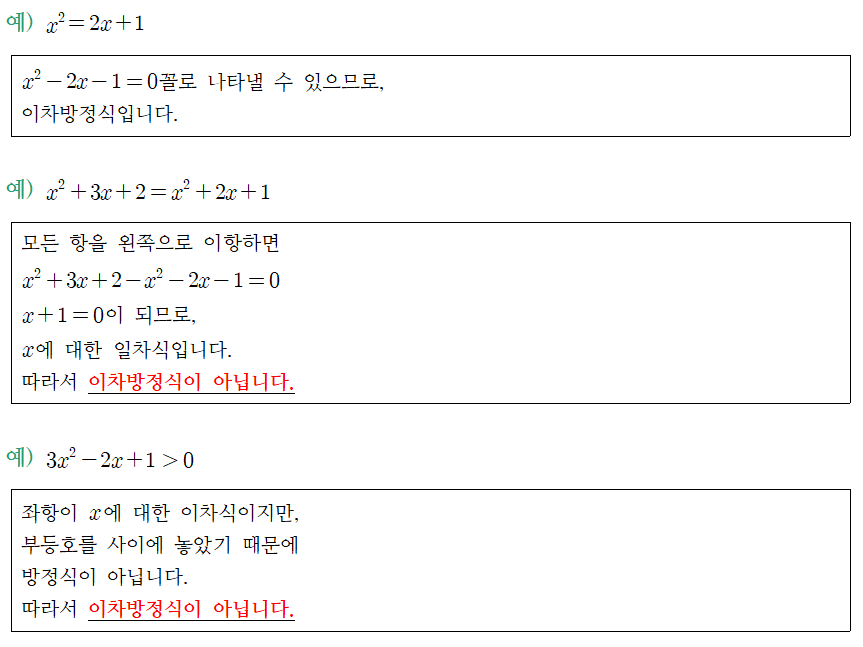 여러 가지 식의 이차방정식을 판정하면 다음과 같이 판정합니다.