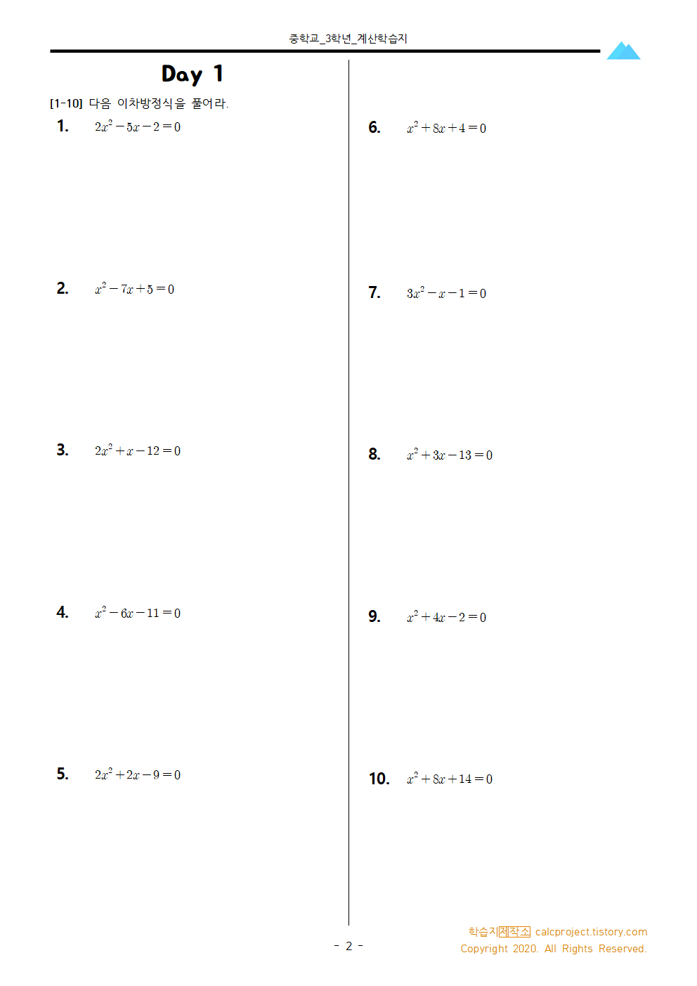 #태그 : 중3, 중학교 3학년, 중3 근의 공식, 이차방정식 학습지, 이차방정식 근의 공식 유도, 근의 공식 연습문제, 이차방정식 무료 문제, 다운, 다운로드, 학습지제작소, 완전제곱식