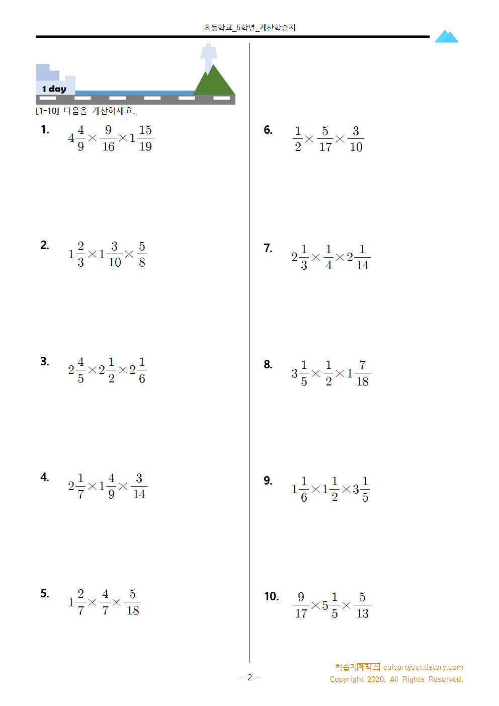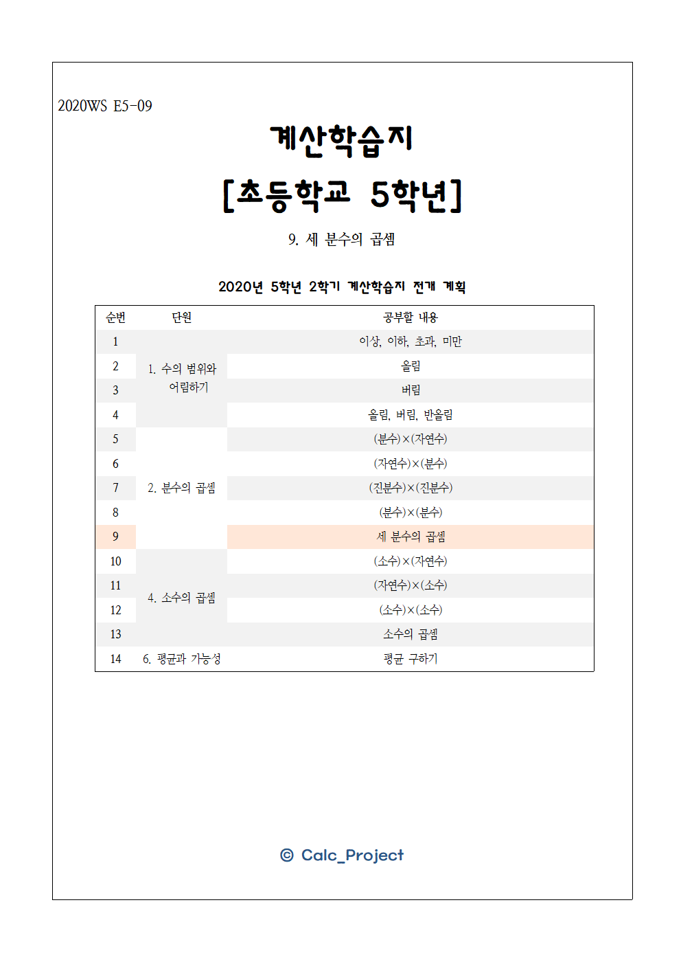 이번 학습지는 세 분수의 곱셈 20문항으로 구성되어 있어