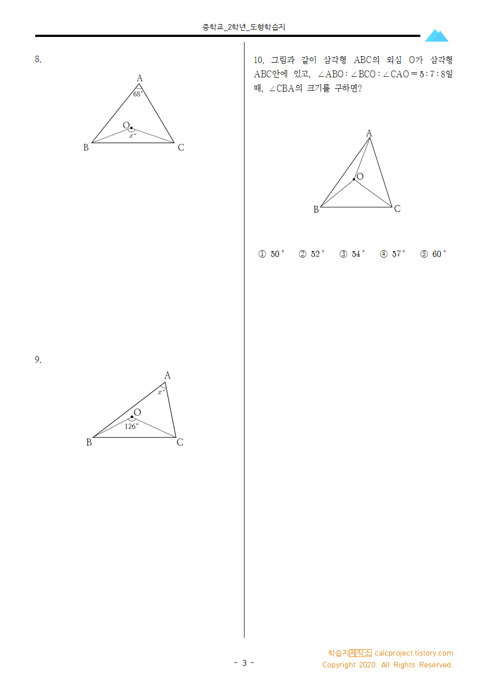 이번 학습지는 삼각형의 외심을 이해하고, 외심의 성질을 이용해 여러 가지 도형을 해석하는 문항으로 구성했습니다.