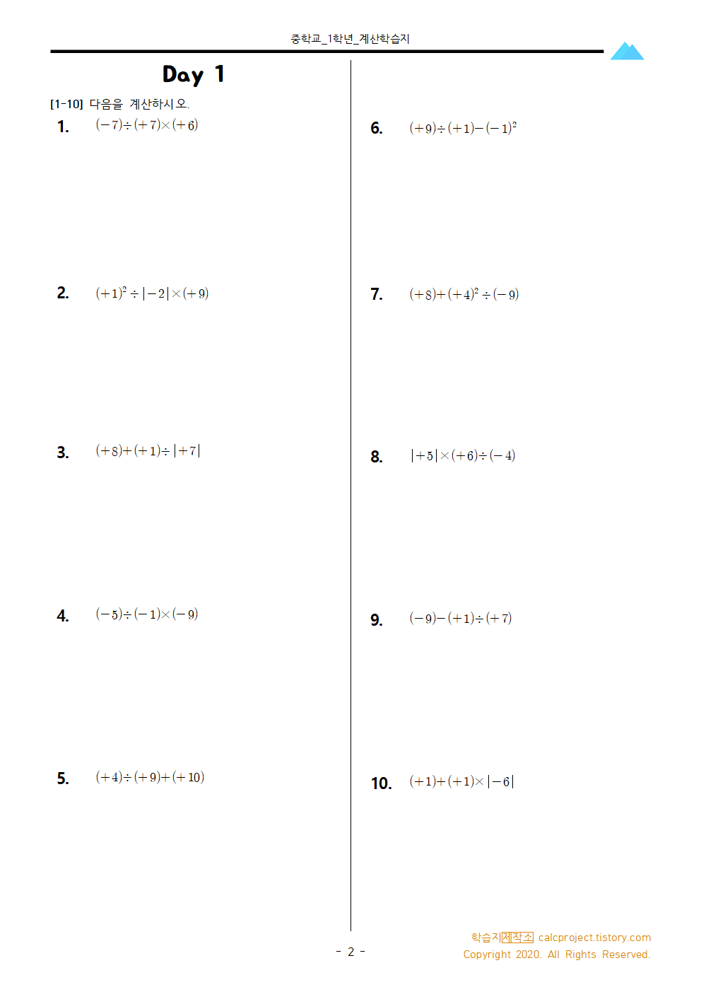 이번 학습지는 정수의 혼합계산으로, 혼합계산의 순서를 연습해볼 수 있도록 곱셈과 나눗셈, 덧셈과 뺄셈이 섞여 있도록 만들었습니다. 문제는 총 30문항으로 충분히 연습할 수 있도록 10문항을 추가했습니다.
