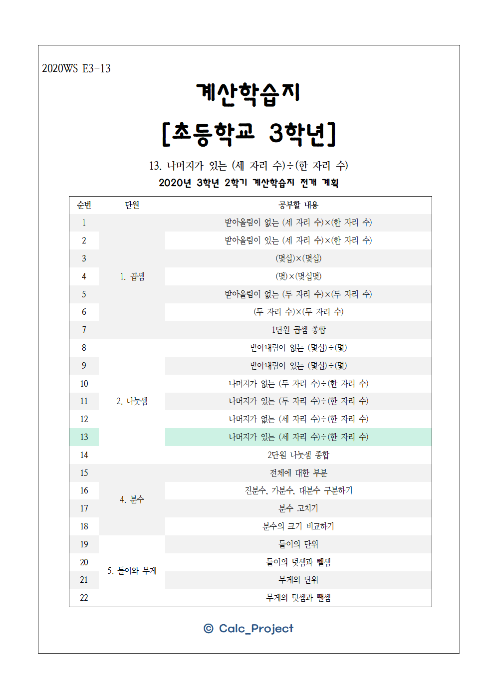 #태그 : 초3, 초등학교 3학년, 세 자리 수와 한 자리 수의 나눗셈, 나머지, 몫, 학습지, 나눗셈 문제, 나눗셈 학습지, 다운, 다운로드, 학습지제작소