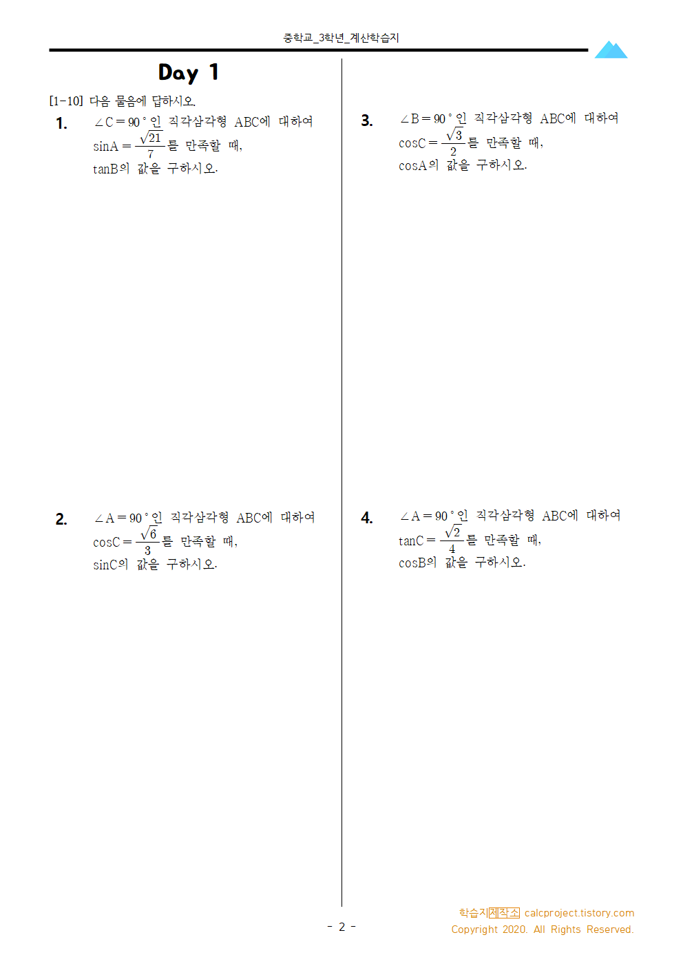 이번 학습지는 중학교 3학년 2학기에 해당하는 첫 학습지로, 직각삼각형에서 직각과 하나의 삼각비가 주어졌을 때 나머지 삼각비를 구하는 내용입니다. 직각삼각형에서 적용할 수 있는 '피타고라스의 정리'를 사용하여 다른 변의 길이를 추론하고, 삼각비를 구해봅시다.