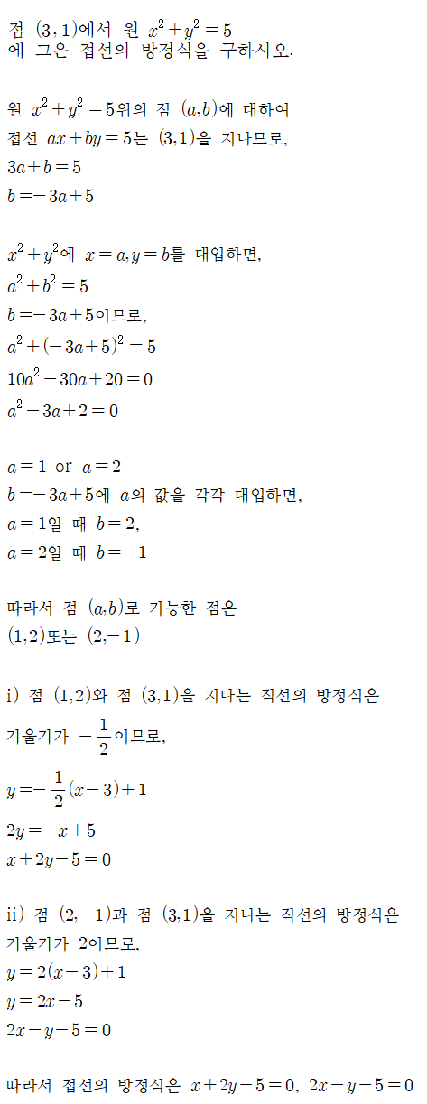 2) 접선의 방정식이 원 밖의 한 점을 지남을 이용하기