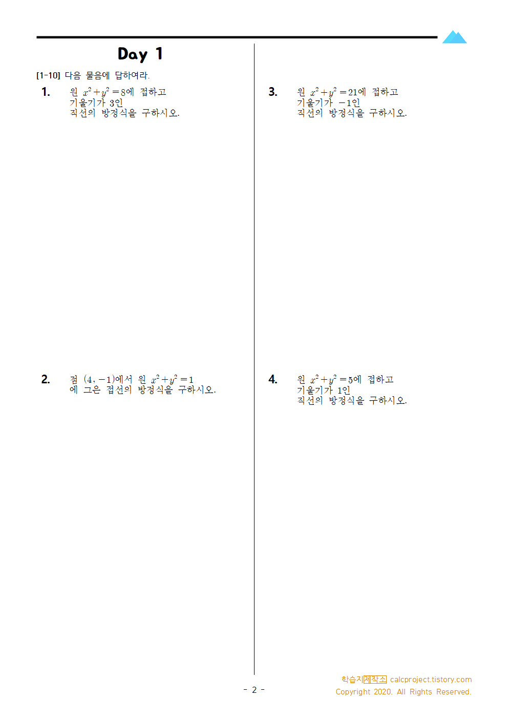 #태그 : 원의 접선, 접선의 방정식, 원의 방정식, 원의 접선 구하는 법, 원의 접선의 방정식 학습지, 고1, 고등수학, 학습지제작소
