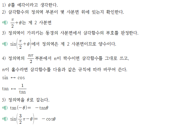 일반각이 들어간 삼각함수의 변환은 정의역이 0보다 작거나, 2π보다 큰 경우 등 보다 넓은 시각에서 삼각함수를 판단할 때 필요한 과정입니다.