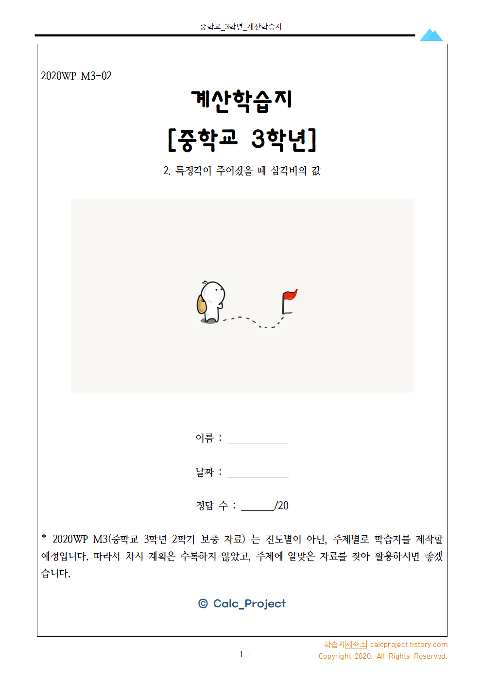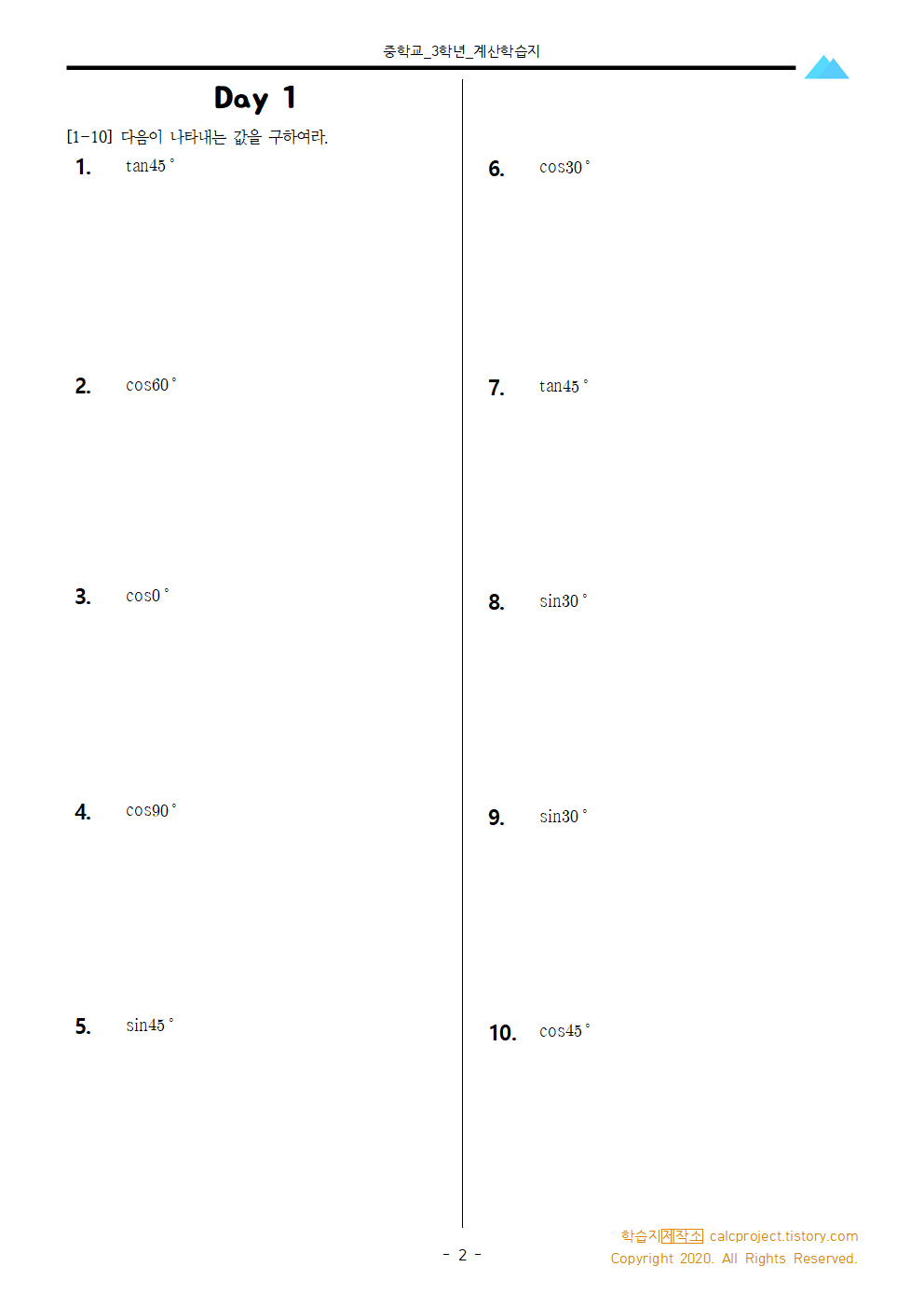 이번 학습지는 특정각 0, 30, 45, 60, 90도가 주어졌을 때 sin cos tan 값을 구하는 문제로 구성했습니다.