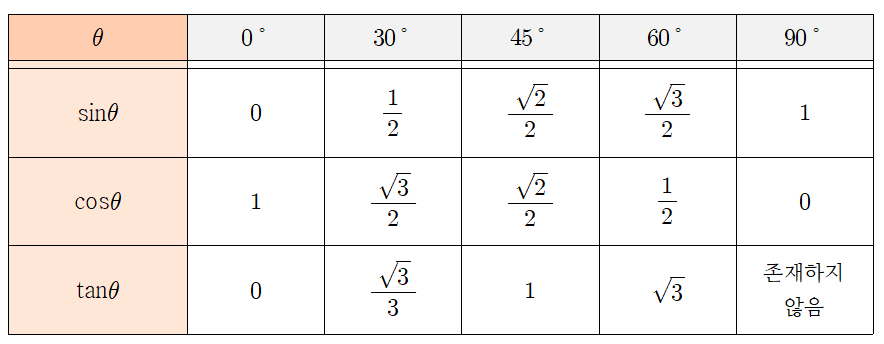 앞서 살펴본 특정각에 대한 삼각비를 정리하면 위와 같습니다.