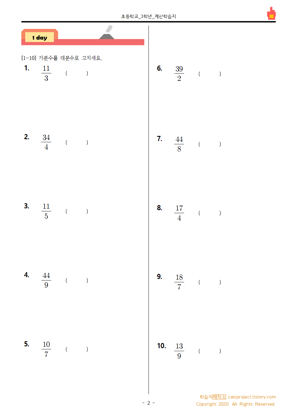 #태그 : 초3, 초등학교 3학년, 가분수, 대분수, 가분수 대분수 문제, 대분수 가분수 문제, 학습지, 다운, 다운로드, 학습지제작소 pdf,
