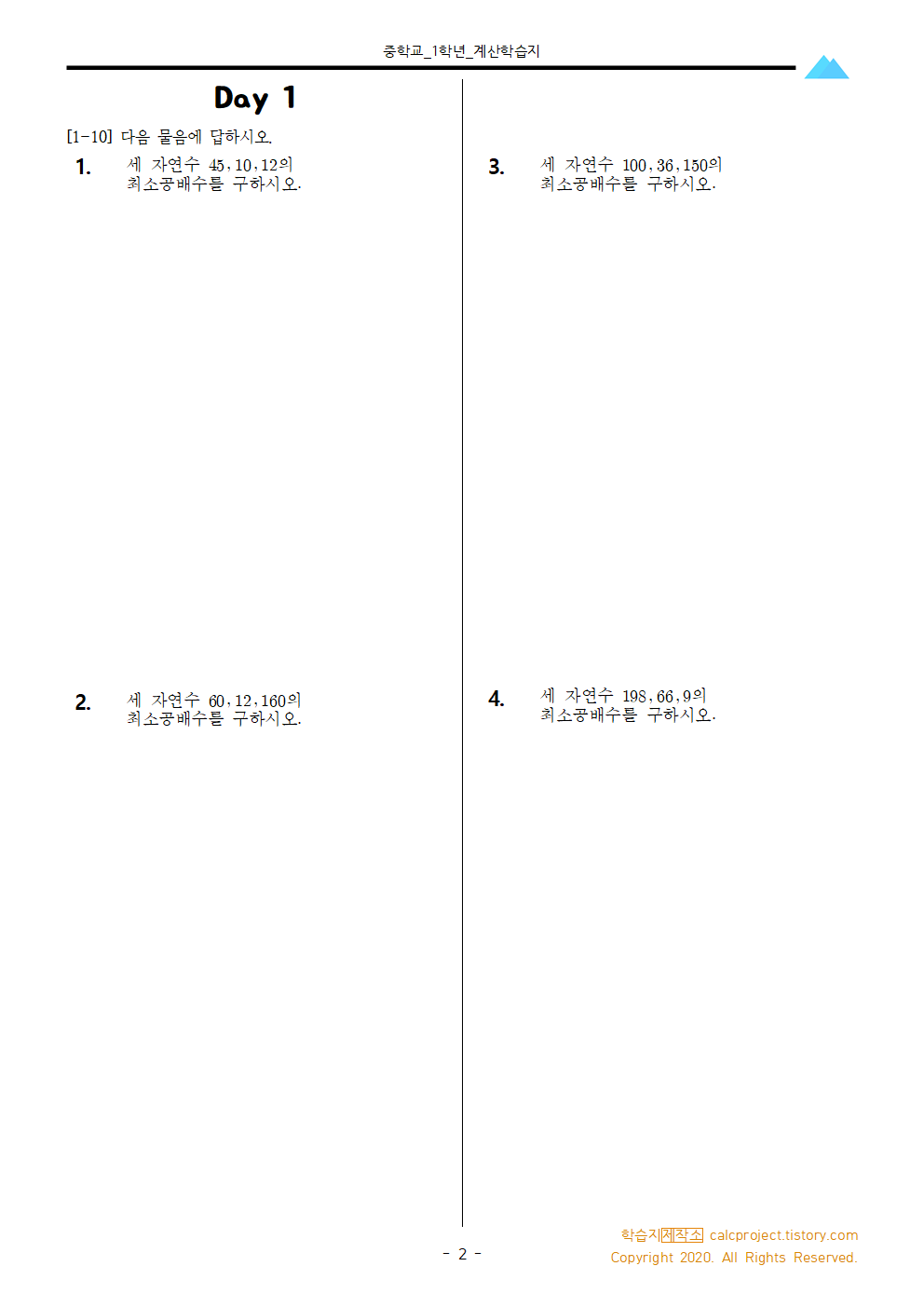 #태그 : 중1, 중학교 1학년, 소인수분해, 최소공배수, 세 자연수의 최소공배수 문제, 세 자연수의 최소공배수 학습지, 다운, 다운로드, pdf, 무료, 학습지제작소