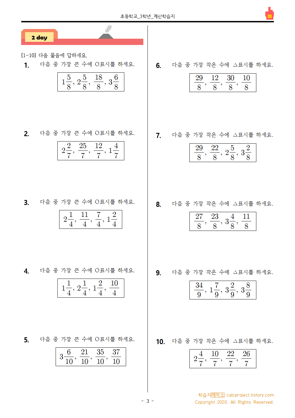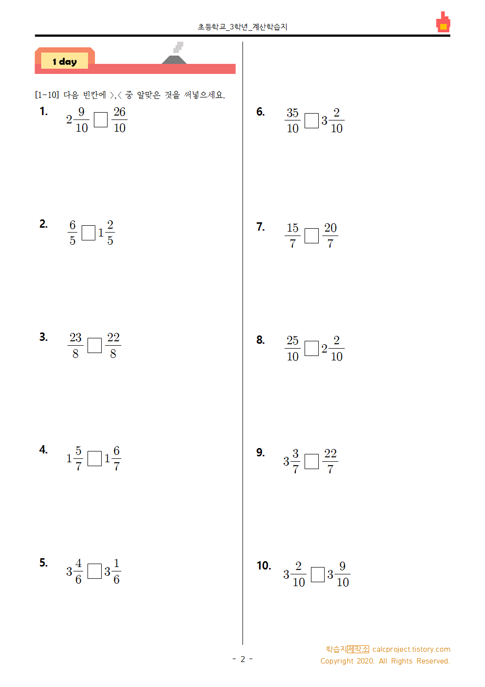 이번 학습지는 가분수와 대분수를 비교하는 문제로, 두 분수를 비교하는 문항 10문항, 네 분수를 비교하는 문항 10문항으로 구성했습니다. Day1을 풀며 간단히 분수를 비교해본 후, Day2에서 여러 분수의 크기를 비교하는 방법을 익혀봅시다.