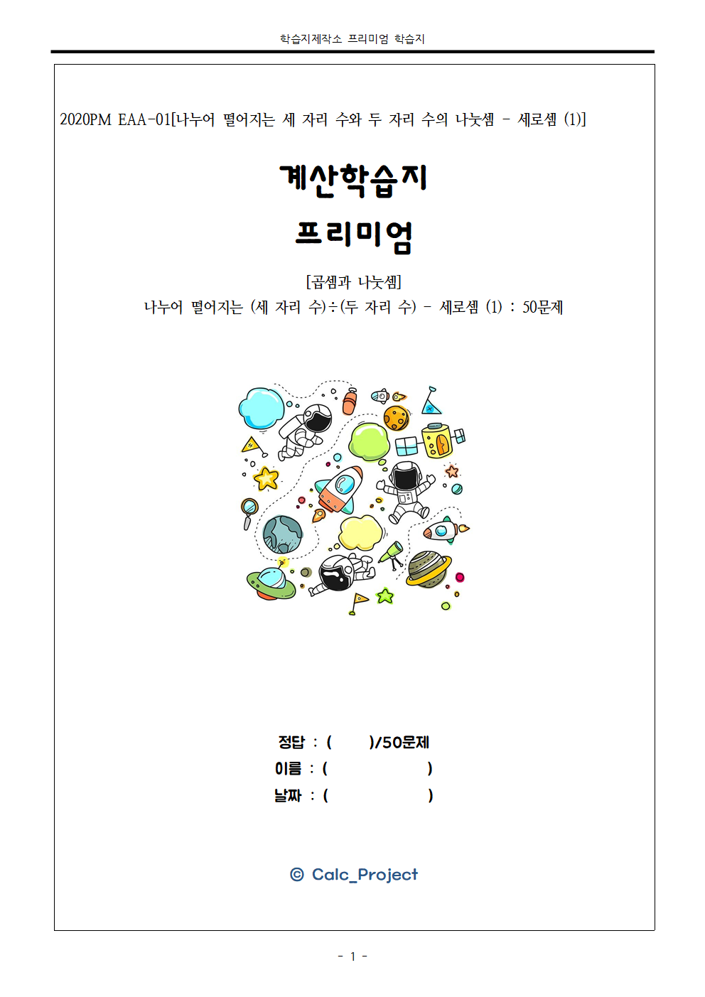 세 자리 수와 두 자리 수의 나눗셈 학습지와와 같은 유형으로, 풍부한 문항으로 나눗셈 연습을 할 수 있도록 하였습니다.