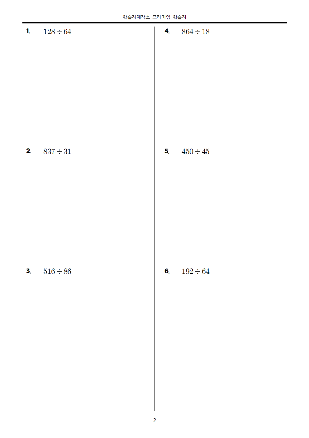 #태그 : 초4, 초등학교 4학년, 학습지제작소, 세 자리 수 두 자리 수 나눗셈, 가로셈, pdf