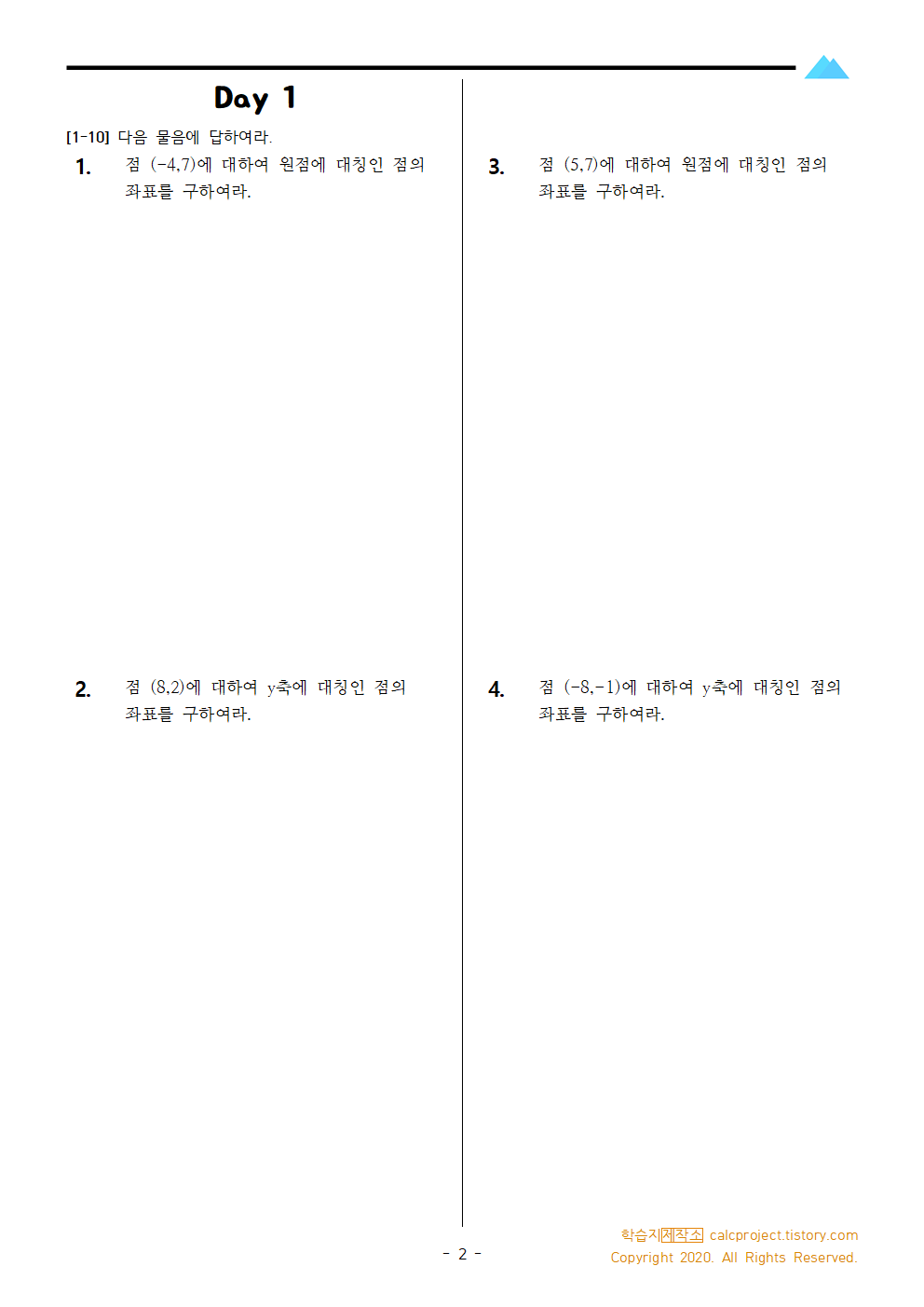 #태그 : 고등수학(상), 점의 대칭이동, x축에 대칭인 점, y축에 대칭인 점, 원점에 대칭인 점, 학습지, 무료 문제, 다운, 다운로드, pdf, 학습지제작소