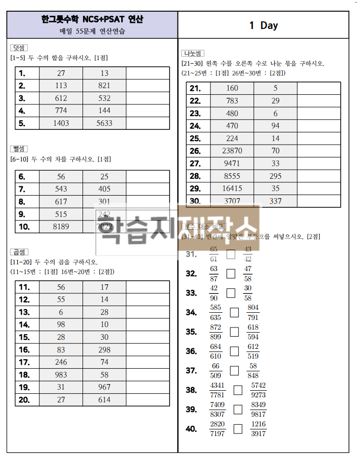 #태그 : NCS, PSAT, 연산교재, 연산문제, 연습, 수학문제, 교재, 한그릇수학
