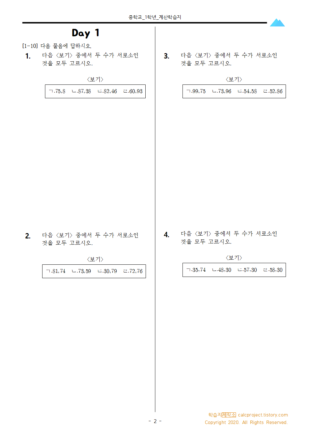 #태그 : 중1, 중학교 1학년, 소인수분해, 서로소 문제, 서로소 뜻, 서로소 푸는 법, 서로소 구하는 방법, 서로소 개수 구하기, 서로소 학습지, pdf, 학습지제작소
