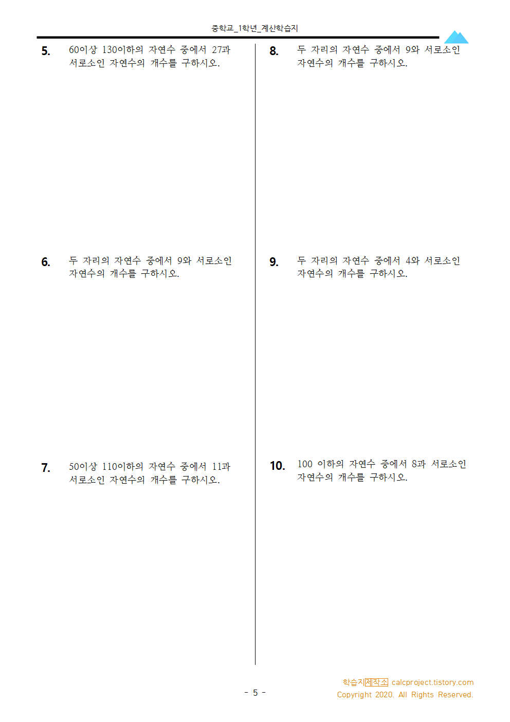 이번 학습지는 서로소를 찾는 문항과 서로소인 서로 다른 자연수의 개수를 구하는 문항으로 구성했습니다.