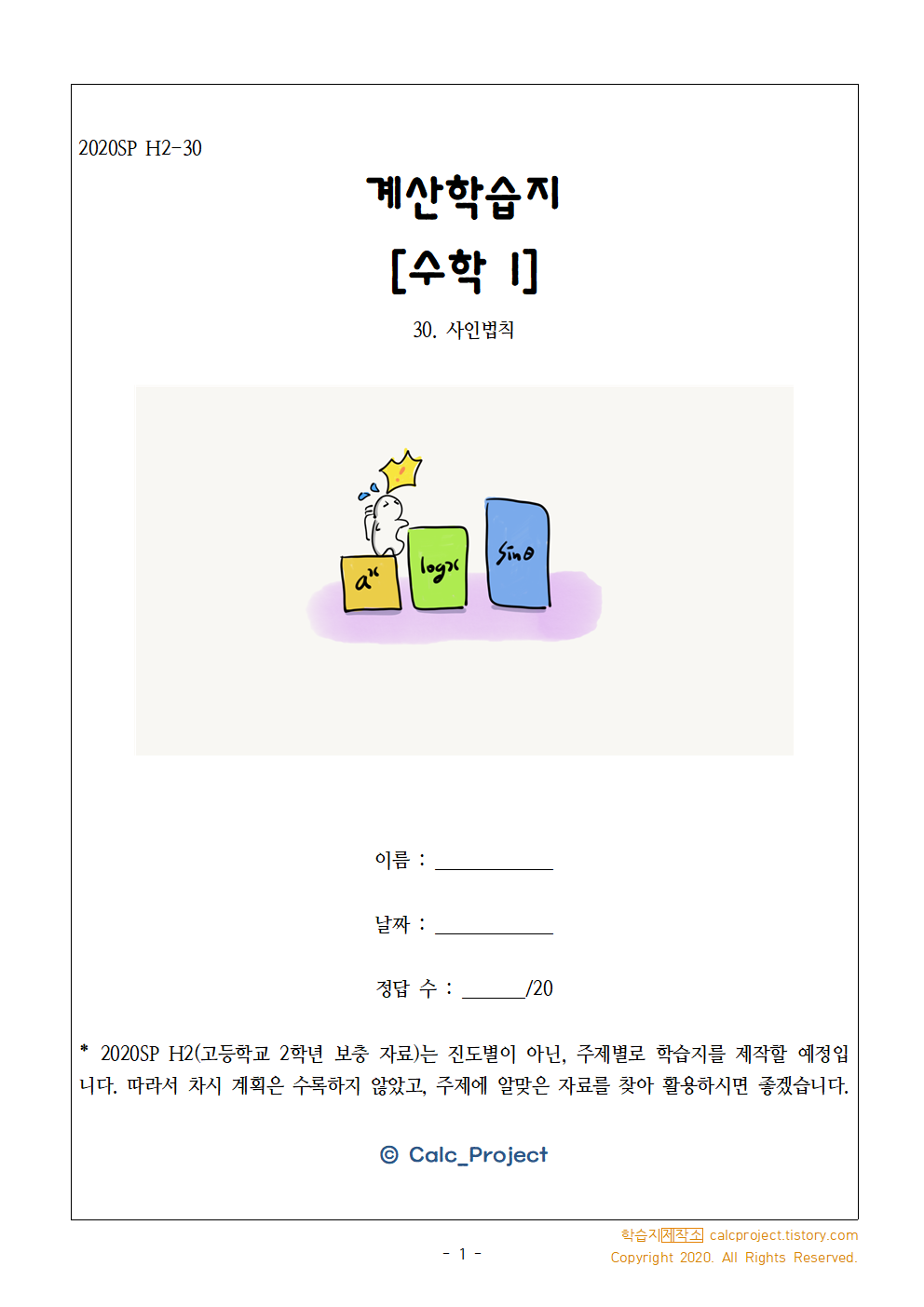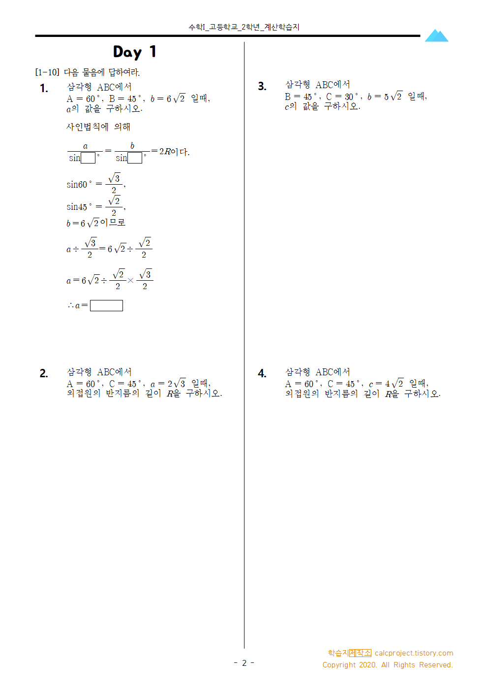 #태그 : 고등학교 2학년, 고2, 수학I, 사인법칙 학습지, 사인법칙 문제, pdf, 다운, 다운로드, 사인법칙 개념, 학습지제작소