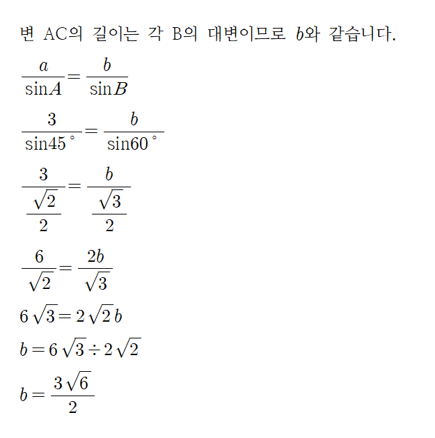 예) 삼각형 ABC에 대하여 A=45˚, B=60˚,