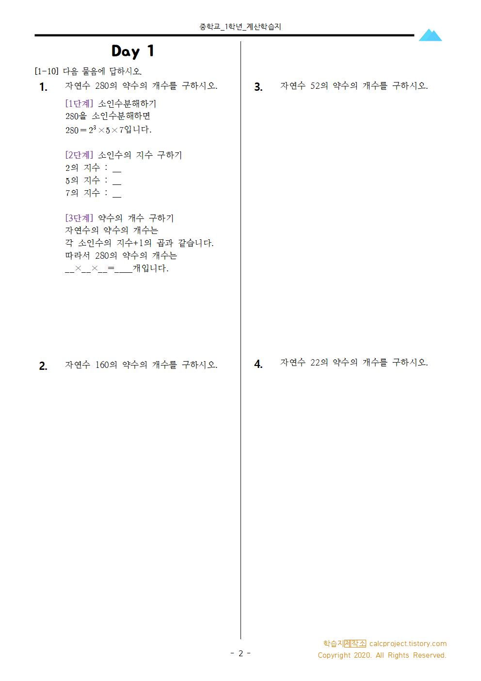 #태그 : 중1, 중학교 1학년, 소인수분해, 자연수의 약수의 개수 구하기, 자연수의 약수 개수 문제, 약수의 개수 학습지, pdf, 학습지제작소