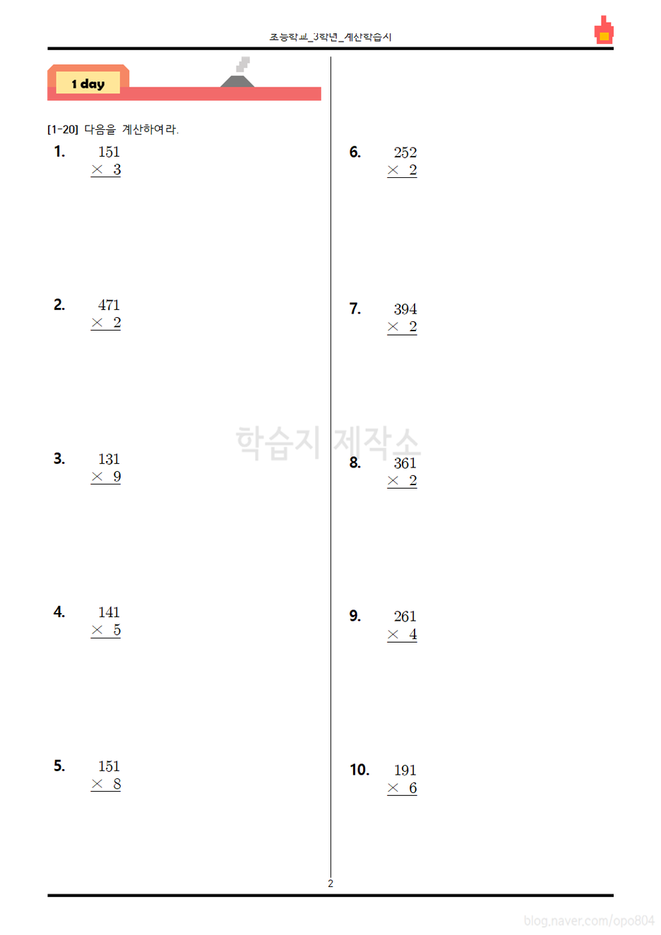 2019년에 만든 3학년 2학기 자료는 세 자리 수와 한 자리 수, 두 자리 수와 두 자리 수의 곱셈 모두 다루고 있습니다. 세 자리 수와 한 자리 수의 곱셈 자료는 1번부터 5번까지, 두 자리 수와 두 자리 수의 곱셈 자료는 6번부터 9번까지 연재됩니다.