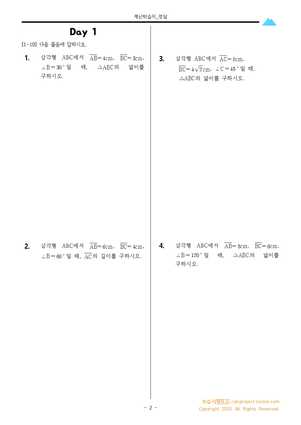 이번 학습지는 앞서 살펴본 삼각비를 가지고 도형의 넓이와 둘레를 구하는 내용입니다. 직접 삼각형을 그려보고, 문제에서 요구하는 것을 삼각비를 활용해 구해보시길 바랍니다.