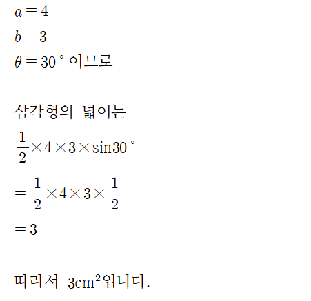 두 변의 길이가 a,b이고 끼인각의 크기가 θ일 때 삼각형의 넓이 S는