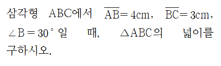 이와 같이 두 변의 길이와 끼인각의 크기를 안다면 삼각형의 넓이를 구할 수 있습니다.