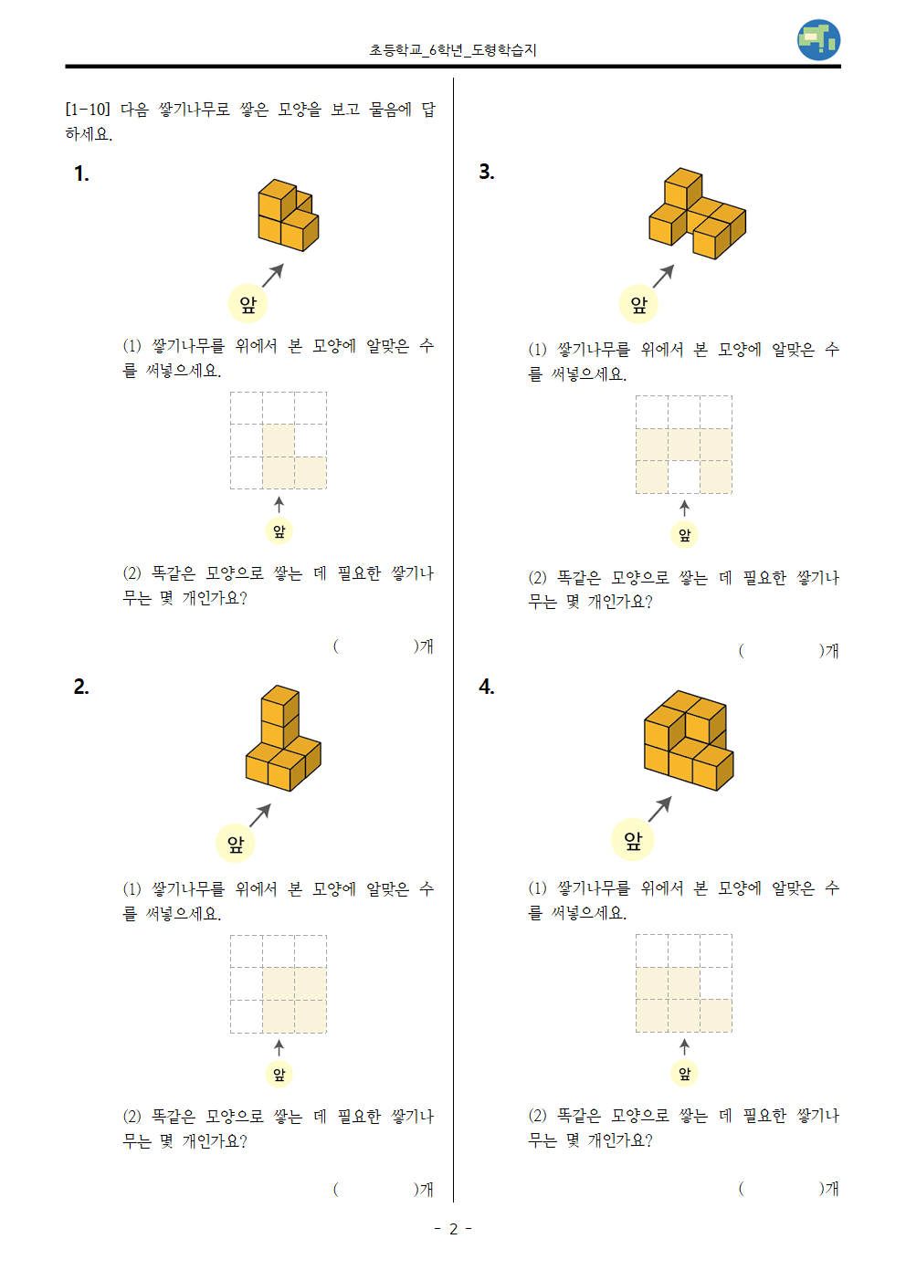 #태그 : 초6, 초등학교 6학년, 공간과 입체, 공간감각, 공간 시각화, 공간 방향, 투영도로 나타내는 방법, 위, 앞, 옆에서 본 모양으로 나타내는 방법, 위에서 본 모양에 수를 써넣는 방법, 학습지, 다운, 다운로드, pdf, 학습지제작소
