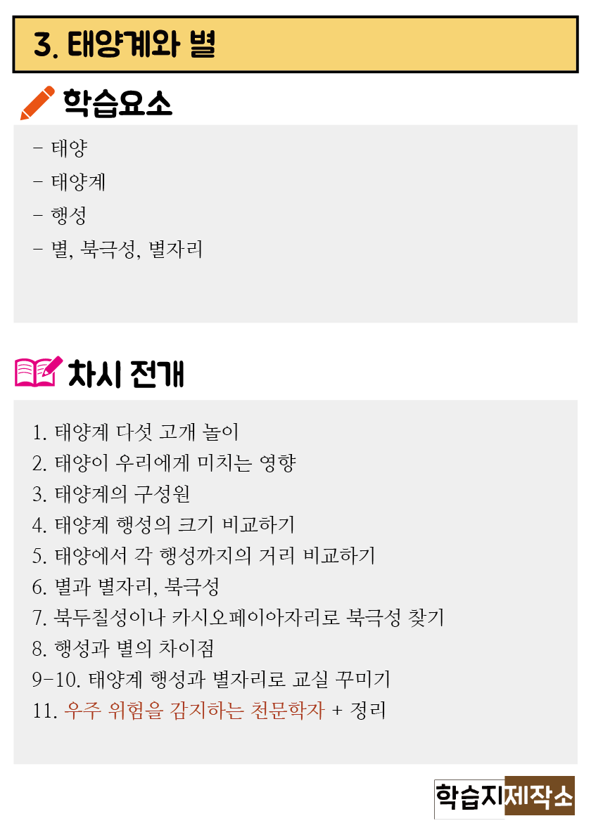 3단원은 태양계와 별입니다. 태양이 우리에게 어떤 영향을 미치는지 탐구하고, 태양계의 구성원을 학습합니다. 그리고 행성마다 태양과의 거리를 알아보고 어떤 행성이 가장 가깝고, 어떤 행성이 가장 먼지 비교해봅니다.