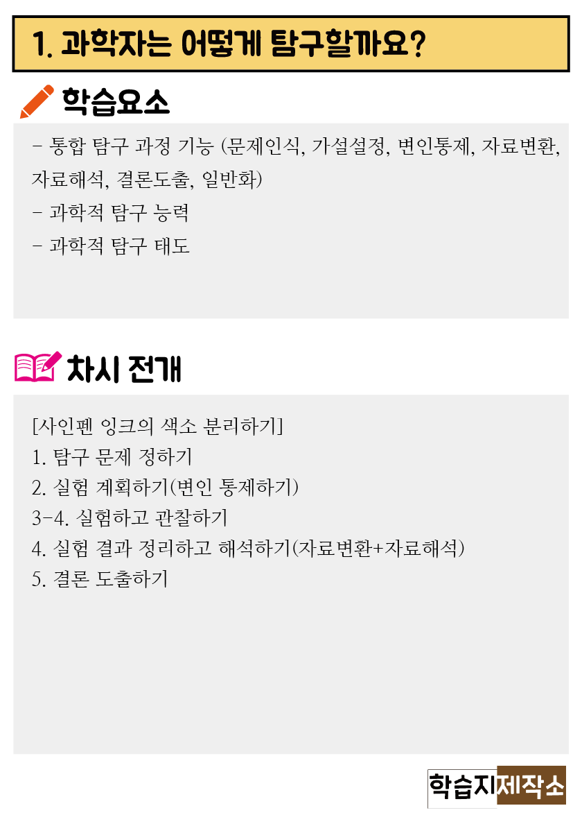 5학년 과학에서는 보다 복합적인 탐구기능을 배웁니다. 통합적인 탐구 능력으로는 문제인식, 가설설정, 변인통제, 자료변환, 자료해석, 결론도출, 일반화가 있습니다. 이 능력들은 과학 탐구의 일련의 과정과 직접적인 관련이 있습니다. 따라서 사인펜 잉크의 색소를 분리하는 실험을 대상으로 이 능력(통합 과학 탐구 기능)을 기릅니다.