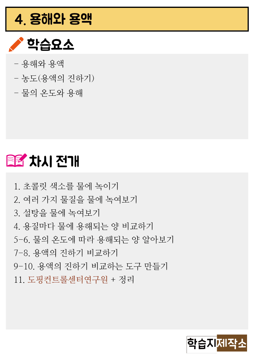 4단원은 용해와 용액입니다. 여러 가지 물질을 물에 녹여보고, 물질에 따라 물에 녹는 양이 다를 수 있음을 알게 됩니다. 물에 녹는 현상을 용해라 부르고, 용해 후 균일하게 녹은 혼합물을 용액이라고 부릅니다.