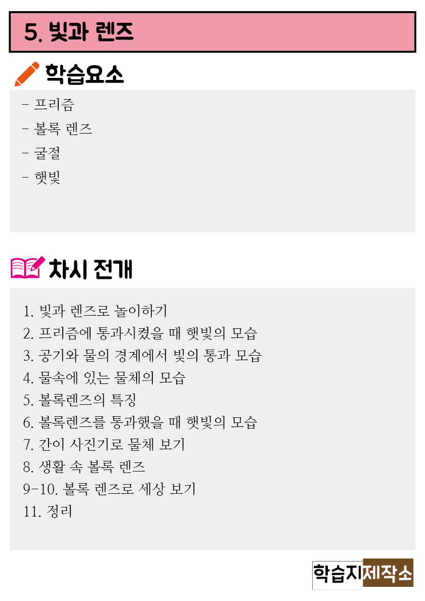 5단원은 빛과 렌즈로, 물이나 볼록렌즈에 빛이 통과하면 어떤 모습을 볼 수 있는지 알아봅니다. 이 과정으로 물 아래 있는 물체가 어떻게 보이는지, 볼록렌즈로 물체를 보면 어떻게 보이는지 관찰해봅니다.