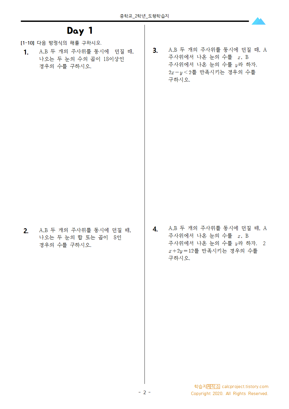 #태그 : 중2, 중학교 2학년, 확률 문제, 경우의 수 문제, 중학교 경우의 수 학습지 다운, 주사위 경우의 수, 학습지제작소