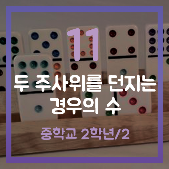 확률 단원은 문제 상황이 다양하게 주어지고, 수학적 개념을 적용시켜야 합니다. 이번 단원부터는 문제를 유형별로 다뤄보고 어떻게 풀 수 있는지 찬찬히 살펴보려고 합니다. 이번 학습지는 두 주사위를 던지는 유형으로 순서쌍을 놓아 경우의 수를 구해보아야 합니다.