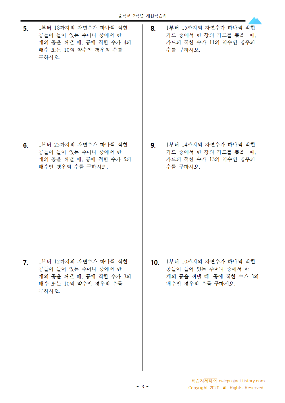 #태그 : 중2, 중학교 2학년, 경우의 수, 약수와 배수, 소수, 수 카드 경우의 수, 공 경우의 수 학습지, 약수 경우의 수 학습지, 배수 경우의 수 학습지, pdf, 학습지제작소