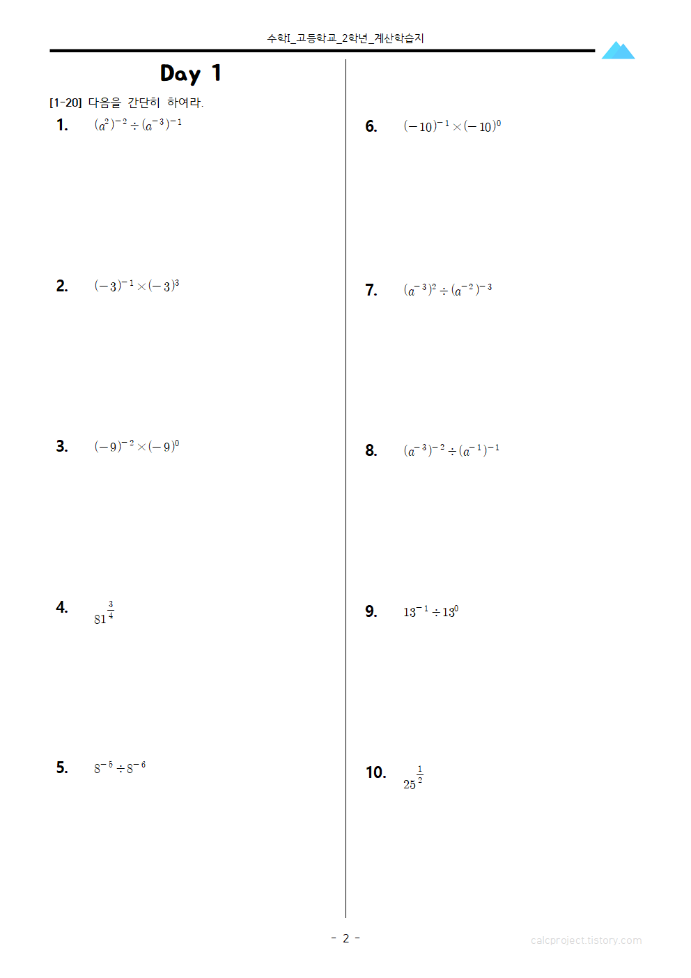 고등학교 2학년 수학 I 학습지는 지수함수와 로그함수부터 다룹니다.
