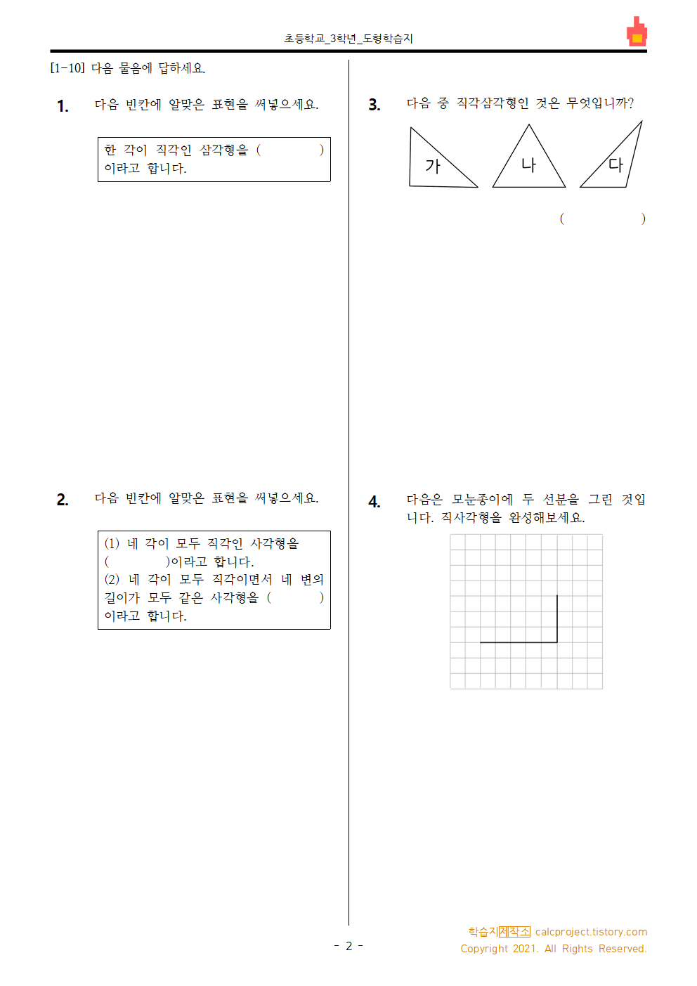 #태그 : 초3, 초등학교 3학년, 평면도형, 직사각형, 직각삼각형, 정사각형 학습지, 초3 평면도형 학습지, 평면도형 문제, 다운, 다운로드, pdf, 학습지제작소