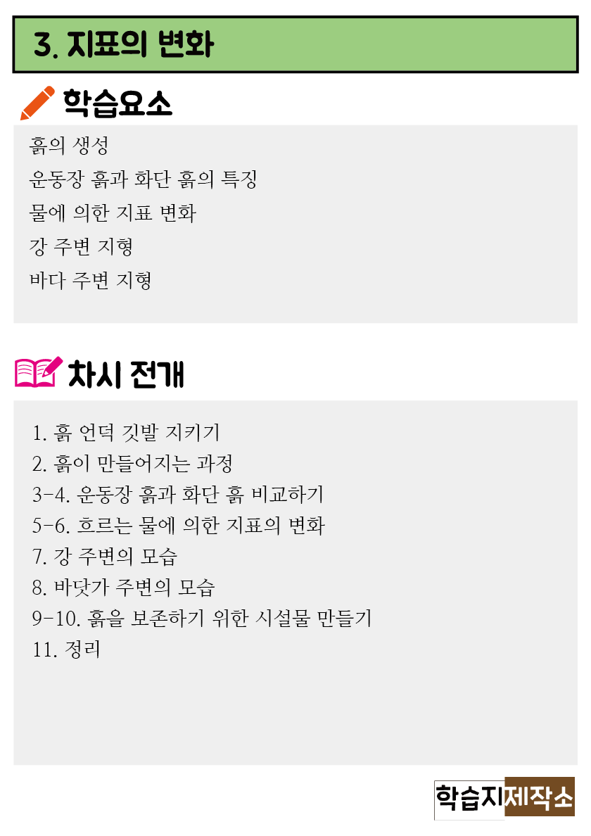 3단원은 '지표의 변화'로 흙의 생성, 지역에 따른 흙의 특징, 물에 의한 지표 변화를 공부합니다. 흙은 바위나 돌이 부서진 잔해와 사체가 섞여 만들어짐을 배웁니다. 상류와 하류의 모습을 알아보고, 바닷가의 해식절벽, 아치, 모래해변이 어떻게 만들어지는지 알아봅니다.