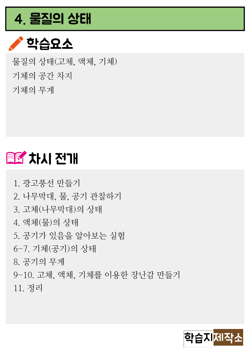 4단원은 '물질의 상태'입니다. 생활 주변의 물질이 세 가지 상태 중 하나로 이루어져있음을 알고, 고체, 액체, 기체를 관찰하고 특징을 알아봅니다. 특히 기체(공기)는 눈에 보이지 않기 때문에 공간을 차지하고 있다는 점(부피), 무게를 가진다는 점을 추가로 학습합니다.