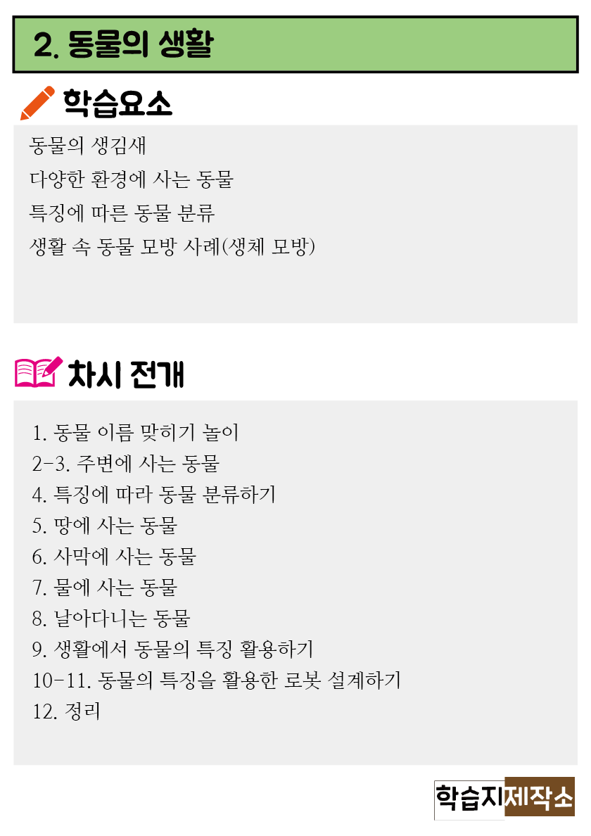 2단원은 '동물의 생활'로 동물의 특징에 따라 동물을 분류하고, 사는 곳에 따른 동물의 모습을 탐구하는 단원입니다. 땅, 물, 사막, 하늘에 사는 동물의 생김새를 살펴보고, 인간이 동물의 특징을 모방한 사례를 알아봅니다.