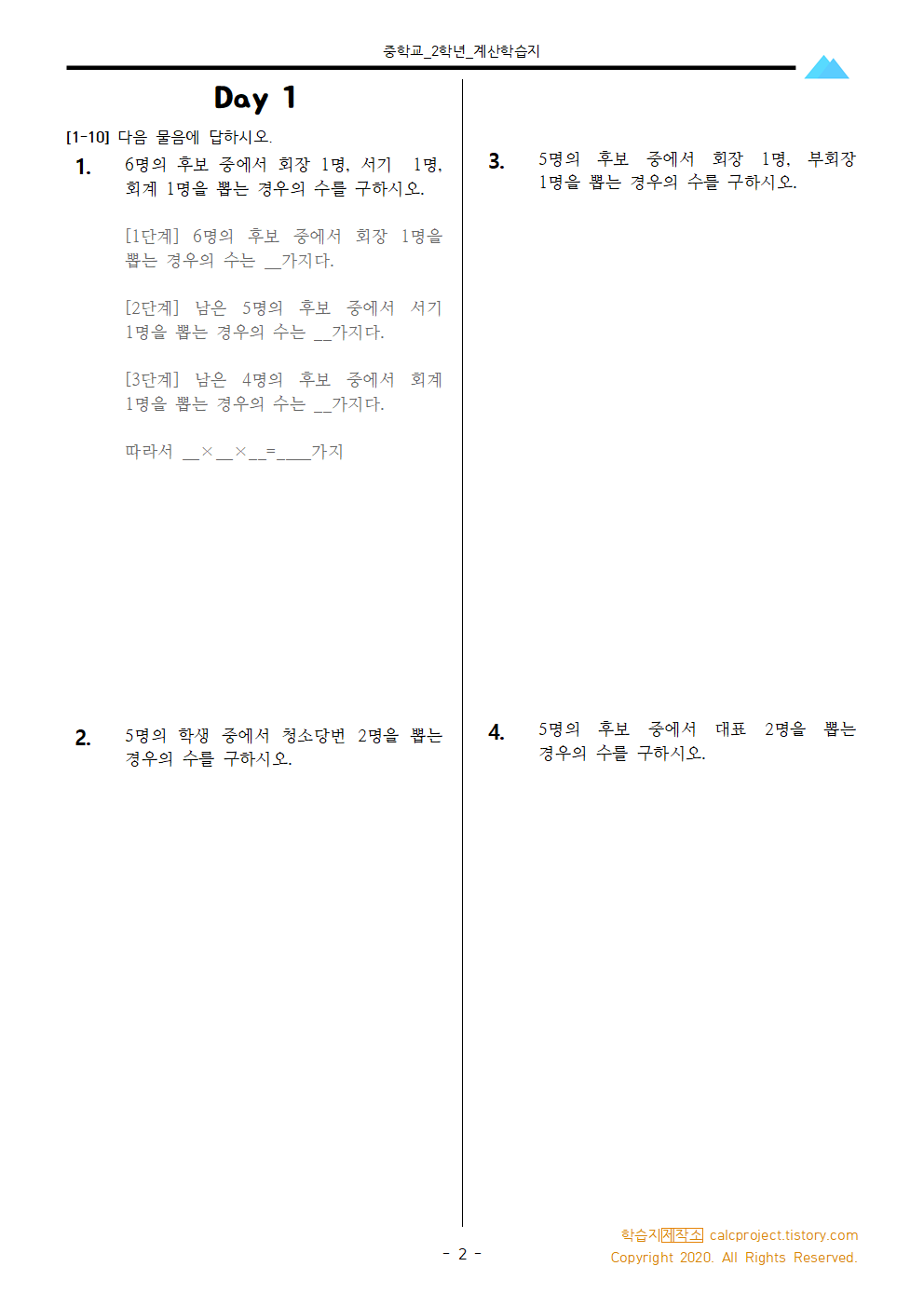 #태그 : 중2, 중학교 2학년 경우의 수, 대표를 뽑는 경우의 수 방법, 자격이 같은 대표, 자격이 다른 대표, 순열, 조합, 중학교 대표 경우의 수 문제, 학습지, 다운, 다운로드, pdf, 학습지제작소