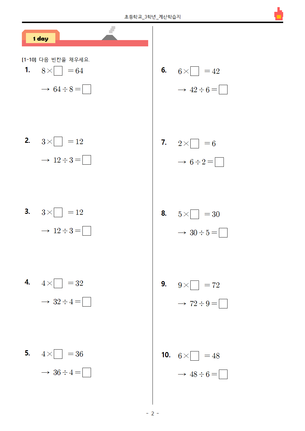 즉, 나눗셈은 곱셈식의 변용에서 시작됩니다. 따라서 9번 학습지는 나눗셈을 기계적으로 하기보다는 나눗셈과 곱셈의 관계를 생각해보는 발판이 될 것으로 기대됩니다.