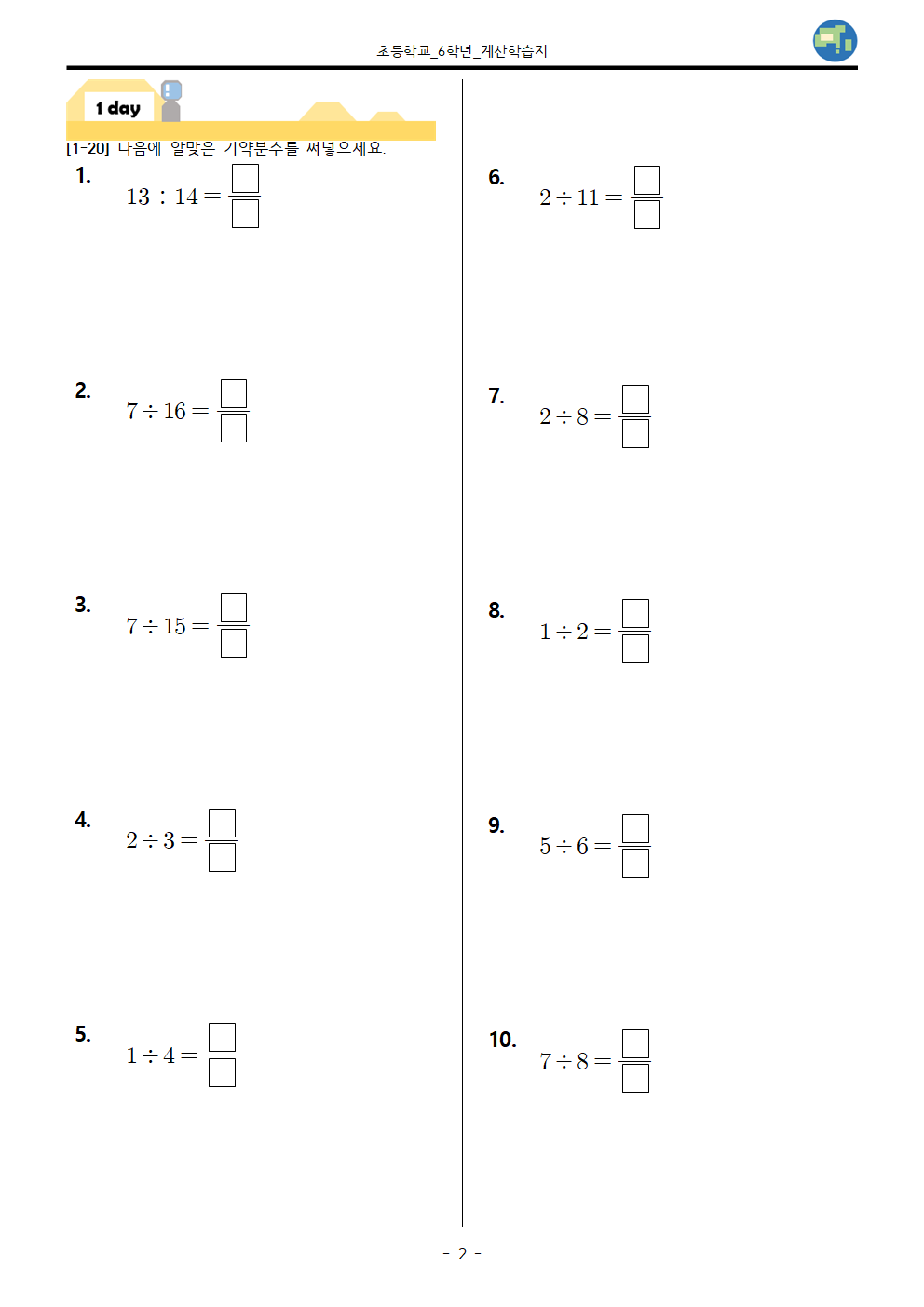 따라서 1번 학습지의 정답도 기약분수의 형태로 쓸 수 있도록 구성하였습니다.