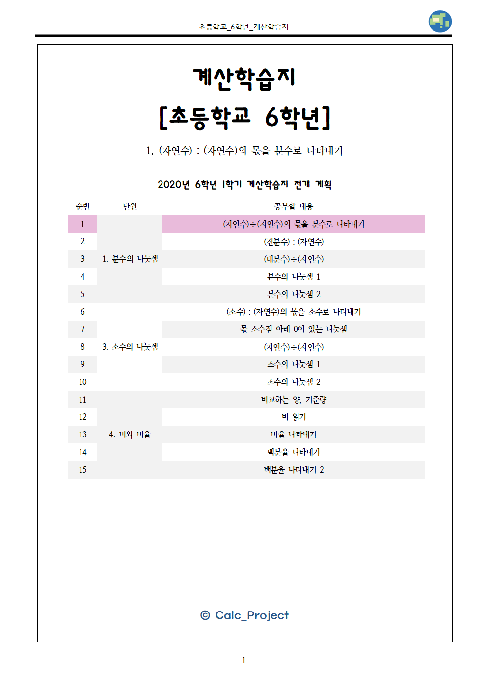 안녕하세요, 학습지제작소입니다. 오늘은 초등학교 최고학년 6학년 1학기에 수학에서 무엇을 배우는지 이야기해보려고 합니다. 6학년 1학기 수학은 분수의 나눗셈, 각기둥과 각뿔, 소수의 나눗셈, 비와 비율, 여..